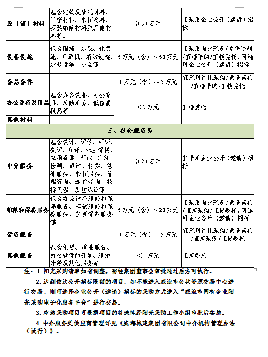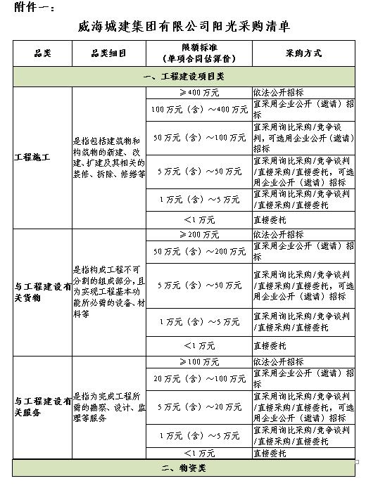第十七條 本制度規(guī)定的采購范圍包括工程建設項目、物資和社會服務的招標采購(詳見附件一《威海城建集團有限公司陽光采購清單》)。