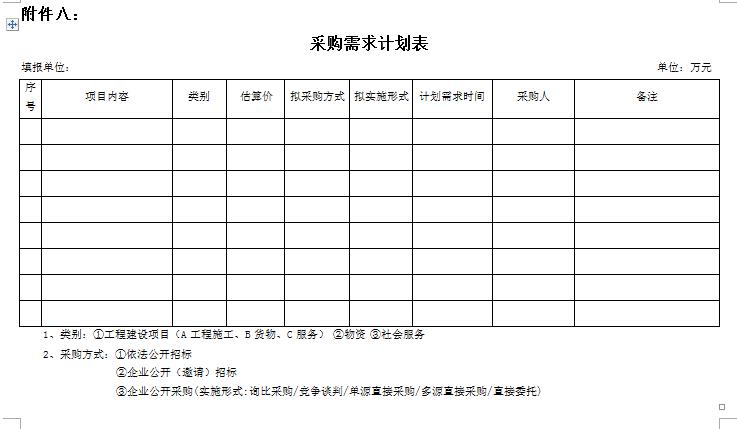 1.年度采購需求計劃表:需求部門(單位)應在本年度12月10日前根據下一年度的工作任務和工作目標,編制并提報下一年度的《年度采購需求計劃表》;