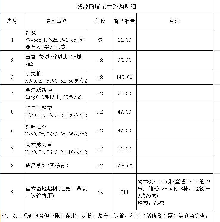 (4)采購內容:城源商廈項目綠化苗木的采購及苗木基地樹苗的起挖、裝車并運輸到工地指定地點,采購清單詳見附件。